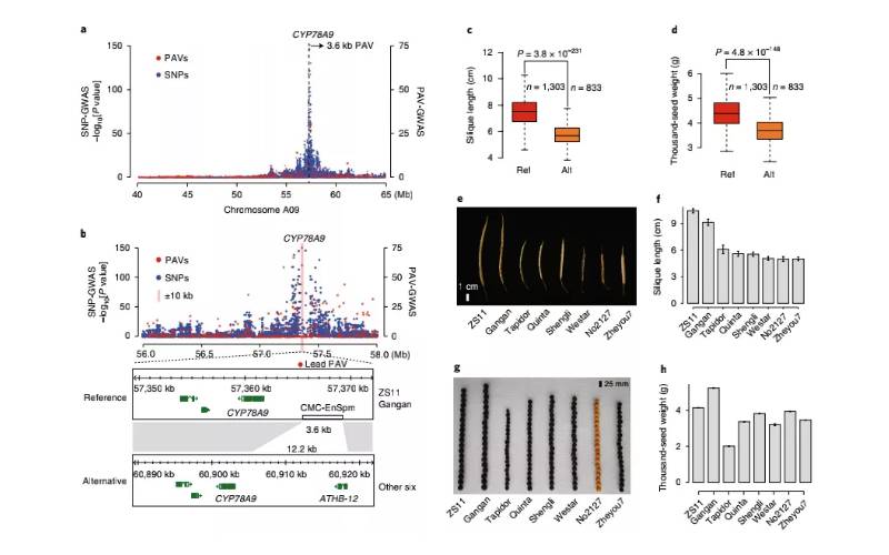 (2)在除水稻以外的作物中也有使用SVs進行GWAS的報道。例如,在玉米中,521個自交系玉米基因組序列中的SVs被用于繪制玉米SV圖譜;在小麥中發(fā)現(xiàn)了影響染色體3B上基因和轉(zhuǎn)座元件的SV;在最近的一項木瓜研究中(使用栽培木瓜和野生木瓜),共鑒定出8083個SVs,其中包括5260個缺失,552個串聯(lián)重復(fù)和2271個插入,在該研究中,還發(fā)現(xiàn)CNVs與生長和對環(huán)境壓力的反應(yīng)有關(guān);在油菜中,基于鑒定得到的數(shù)百萬SVs和PAVs用于PAV-GWAS,直接鑒定到了莢果長度、種子重量和開花時間相關(guān)的結(jié)構(gòu)變異,這些是之前基于單核苷酸變異SNP進行的GWAS所沒能鑒定出來的,充分說明了PAV-GWAS可以互補于SNP-GWAS用來鑒定特定性狀相關(guān)的位點(圖7);另外,其他植物SVs鑒定例子包括:溝酸漿屬的耐鹽性、葡萄的漿果顏色和番茄的馴化性狀等研究。
