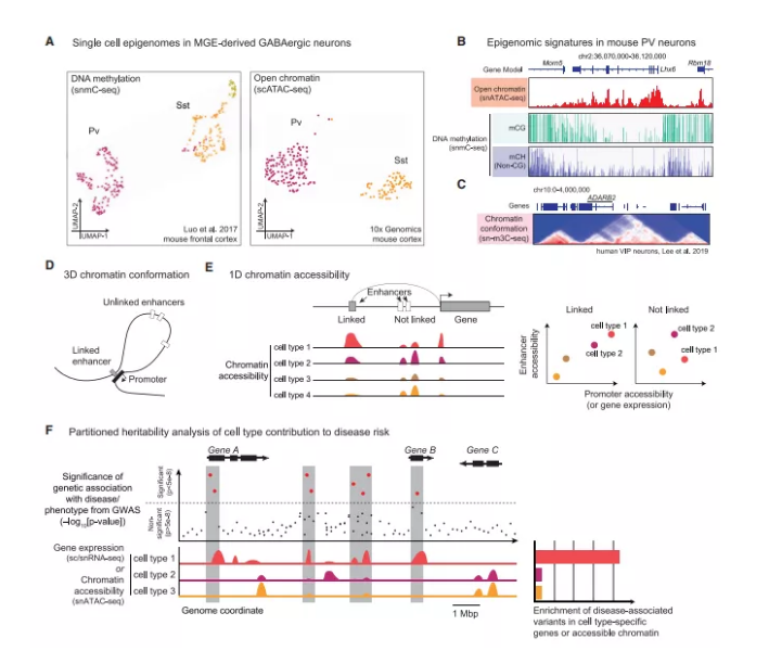 盡管全基因組關(guān)聯(lián)研究(GWASs)已經(jīng)確定了一些神經(jīng)和精神疾病的風(fēng)險(xiǎn)位點(diǎn),但每種疾病中特定腦細(xì)胞類型的脆弱性在很大程度上仍是未知的。通過細(xì)胞類型特異性轉(zhuǎn)錄組或表觀基因組的遺傳分析可以識(shí)別活躍基因在GWAS風(fēng)險(xiǎn)位點(diǎn)附近富集的細(xì)胞類型,表明其在疾病中可能具有直接或間接的作用(圖3F)。