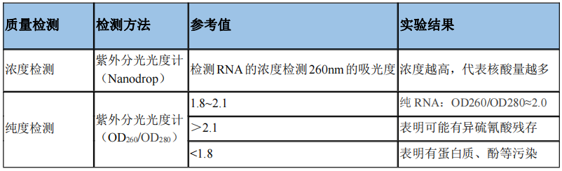 表1:通過紫外分光光度計檢測RNA的濃度和純度