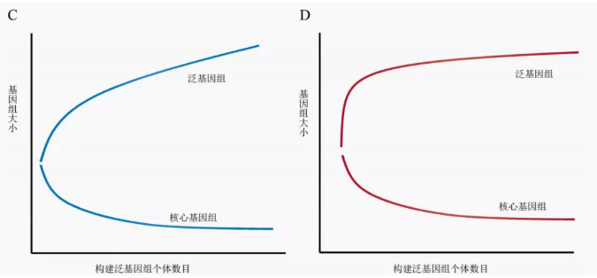 廣義的泛基因組是指獲取該物種全部遺傳信息,構(gòu)建一個(gè)非冗余的集合體。由于個(gè)體間的差異,在構(gòu)建泛基因組的時(shí)候會(huì)在參考基因組的基礎(chǔ)上,不斷引入新的特異性序列。因此,統(tǒng)計(jì)結(jié)果可發(fā)現(xiàn)整個(gè)泛基因組的大小隨著個(gè)體數(shù)量的增加而增加,核心基因組(幾乎存在與全部個(gè)體基因組中)的大小隨著個(gè)體數(shù)量的增加而減?。ㄈ鐖D1)。