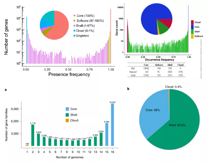 隨著基因組數(shù)量的增加,核心基因的識(shí)別將嚴(yán)重受到denovo中組裝錯(cuò)誤的影響。為了糾正這種錯(cuò)誤,一些科研工作者將泛基因組進(jìn)一步細(xì)分:在所有基因組的為核心基因(core),在幾乎所有品系中發(fā)現(xiàn)的為soft-core,在比soft-core少但不止幾個(gè)品系的品系中發(fā)現(xiàn)的shell,以及在只有幾個(gè)品系中發(fā)現(xiàn)的為cloud。具體的分類比例與樣品數(shù)量間的關(guān)系并不固定,目的均是為了對(duì)基因進(jìn)行分組,以便進(jìn)行可靠的比較(圖3)。而這些分組的基因頻率呈現(xiàn)不對(duì)稱的首尾高中間低的分布形式,充分展示了不同類別基因型的占比情況。