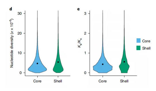 眾多研究表明,非核心基因比核心基因的可變性更強(qiáng);與核心基因集相比,非核心基因集中的非同義突變比同義突變的比率要高。因此通過同義與非同義突變(ka/ks)可以用來檢測(cè)非核心基因集中基因是否受到選擇作用。