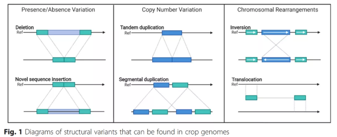結(jié)構(gòu)變異是泛基因組的重點(diǎn)研究對(duì)象,這些變異信息為物種的人為選擇及自然選擇提供原始的材料。了解變異產(chǎn)生的過程,探究不同材料的變異程度并利用有利的變異對(duì)維持并提高物種生產(chǎn)力至關(guān)重要,有助于解析物種表型和農(nóng)藝性狀的多樣性。泛基因組研究,為更好地了解SV在動(dòng)植物馴化中的作用提供了基礎(chǔ)。主要研究的變異類型為:SNP(Single nucleotide polymorphism),即單核苷酸多態(tài)性變異,主要指在基因組水平上由單個(gè)核苷酸的變異所引起的DNA序列多態(tài)性,這種變異可由單個(gè)堿基的轉(zhuǎn)換(transition)或顛換(transversion)所引起。InDel(Insertion-Deletion),指的是在基因組的某個(gè)位置上所發(fā)生的小片段序列的插入或者刪除,其長(zhǎng)度通常在在 2 bp-50 bp 之間。SV(Structure Variantions),即基因組結(jié)構(gòu)性變異,通常指的是基因組上大長(zhǎng)度的序列變化和位置關(guān)系變化,有豐富的變異類型,包括長(zhǎng)度在50bp以上的長(zhǎng)片段染色體倒位、染色體易位、重復(fù)、存在/缺失(PAV)、拷貝數(shù)變異(CNV)。