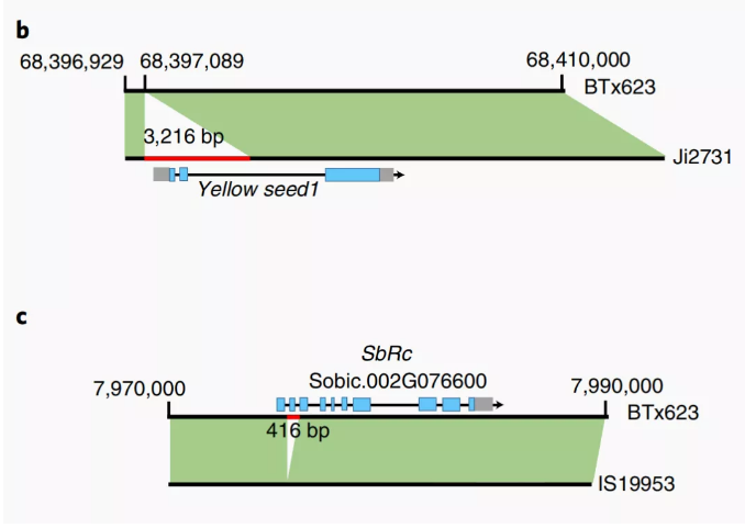 例如高粱泛基因組研究發(fā)現(xiàn),相對(duì)于參考基因組,其它高粱個(gè)體基因組中有429~1118個(gè)基因存在拷貝數(shù)變異(CNV)。功能注釋顯示這些CNV基因豐富了防御反應(yīng)、信號(hào)轉(zhuǎn)導(dǎo)和細(xì)胞蛋白分解代謝等生物學(xué)過程。并且不同高粱個(gè)體基因組上存在大量的存在缺失變異(PAV),有2514個(gè)基因受PAV嚴(yán)重影響,這些基因富集于與生物和非生物脅迫相關(guān)的生物過程,而抗病基因在這組基因中顯著富集。進(jìn)一步研究發(fā)現(xiàn)Yellow seed1、SbRc的PAV影響到高粱籽粒顏色變化(圖9)