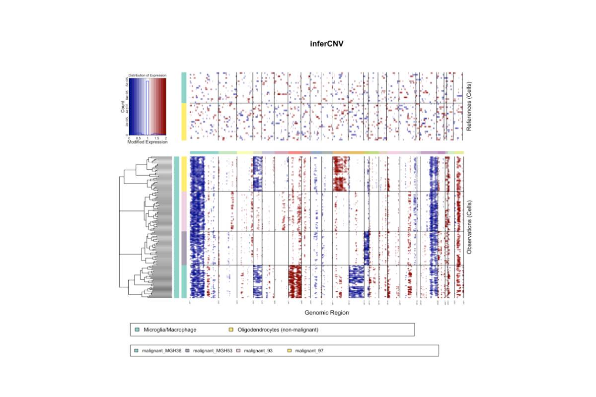 2014年發(fā)表在science(IF=47.728)上的《Single-cell RNA-seq highlights intratumoral heterogeneity in primary glioblastoma》[1],通過對基因相對表達水平來推斷每個細胞的大規(guī)??截悢?shù)變異(CNV)。該研究選擇正常人的腦組織bulk RNA-seq的數(shù)據作為對照,單細胞樣本聚為7組,無監(jiān)督分析確定了9個異常細胞,它們具有成熟少突膠質細胞基因表達增加和膠質母細胞瘤基因下調的特點,剩余的420個細胞中沒有一個顯示出與非惡性細胞或免疫細胞類型的轉錄程序相似的特征。雖然非惡性細胞是腫瘤微環(huán)境的關鍵組成部分,但該研究通過解離和CD45+分選后,已經很大程度上排除了非腫瘤細胞。該研究通過infer CNV有效地將腦膠質母細胞瘤中的正常細胞與惡性細胞區(qū)分開來。