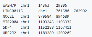 (3) 基因或染色體位置文件:提供每個基因的染色體位置。文件共4列,分別是基因名稱、染色體和基因跨度,文件以制表符分隔。