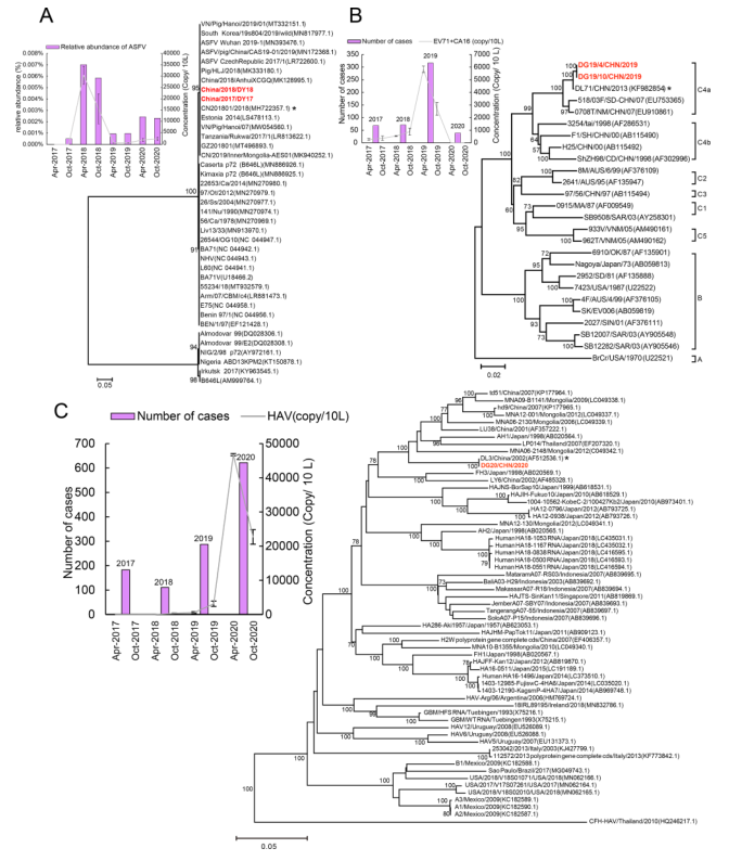 在DY發(fā)現(xiàn)了非洲豬瘟病毒(ASFV)和豬痘病毒(Swinpox Virus)等幾種病毒。ASFV在2017年10月被檢測(cè)到,并在2018年達(dá)到頂峰(圖6A),并通過(guò)qPCR證實(shí)。qPCR在2018年4月后連續(xù)檢測(cè)到ASFV,其中2018年4月的病毒載量為3.0×103拷貝/L。在DG地點(diǎn)未檢測(cè)到ASFV和Swinpox病毒,在兩個(gè)地點(diǎn)均未檢測(cè)到其它人畜共患病DNA病毒。通過(guò)高通量微流控芯片檢測(cè)檢測(cè)了40種致病性RNA病毒的存在。DY樣品中,經(jīng)qPCR確認(rèn),2019年僅檢測(cè)到諾如病毒、流行性腮腺炎病毒、鼻病毒和Human herpesvirus 6病毒。DG樣品中,2017年至2019年在樣本中檢測(cè)到human enterovirus 71 (EV71),2020年4月檢測(cè)到Coxsackievirus 16 (CA16)。