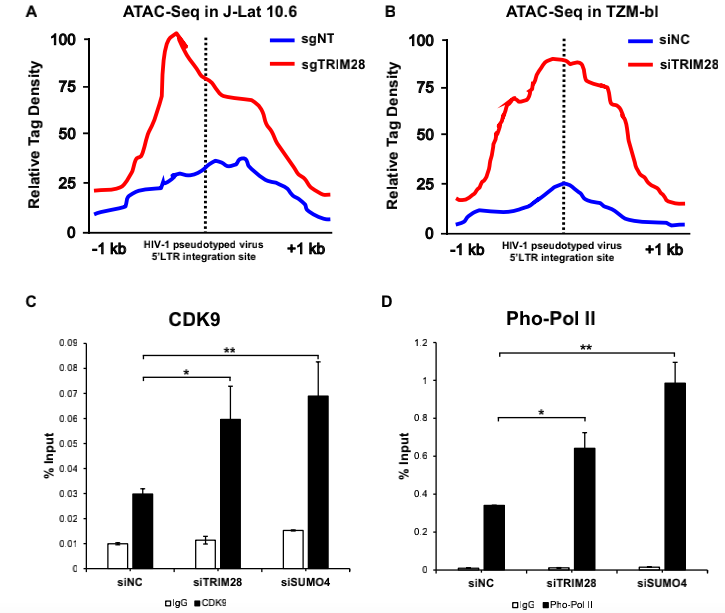 ATAC-seq:J-Lat 10.6或TZM-bl細胞系,研究TRIM28缺失后HIV-1啟動子的染色質(zhì)可及性