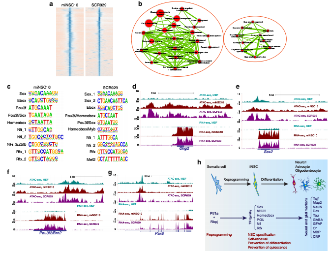 由體細胞重編程的誘導(dǎo)性神經(jīng)干細胞(induced neural stem cells,iNSC)在神經(jīng)疾病的細胞替代療法和體外建模中具有巨大的潛力。已有研究證明將成纖維細胞直接轉(zhuǎn)化成iNSC的方法依賴于幾個關(guān)鍵的神經(jīng)前體細胞轉(zhuǎn)錄因子(TF),這就提出了一個問題:這種直接的重編程是否可以由非神經(jīng)前體細胞調(diào)控TF來實現(xiàn)。通過RNA-seq和ATAC-seq分析結(jié)果,作者發(fā)現(xiàn)非神經(jīng)前體細胞調(diào)控TFPtf1a可以將小鼠和人的成纖維細胞直接重編程為具有分化出神經(jīng)元、星形膠質(zhì)細胞和少突膠質(zhì)細胞的潛能和自我更新能力的iNSC,并在移植后可以改善阿爾茨海默病小鼠模型的認知功能障礙。相比于MEF,miNSC10和SCR029細胞,Ptf1a重編程的miNSC自我更新和維持所需要的Notch信號通路相關(guān)基因均顯著上調(diào),并且這些位點也顯示出差異的ATAC-seq圖譜。說明Ptf1a的重編程活性是通過與Rbpj結(jié)合的非Notch信號依賴途徑,來維持NSC特化、自我更新和體內(nèi)穩(wěn)態(tài)。同時作者的數(shù)據(jù)確定了這是一種用于研究和治療的更安全的非典型iNSC。