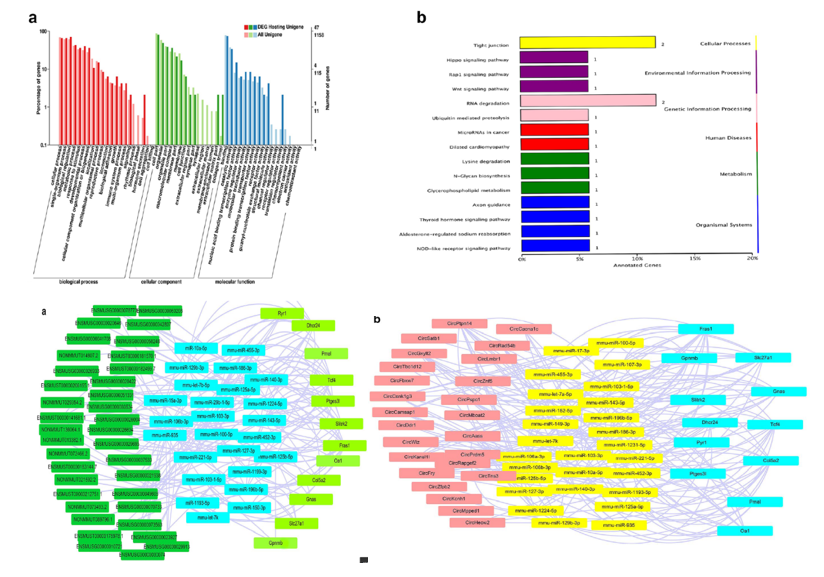 2. 差異非編碼RNA靶基因預(yù)測(cè):GO term和pathway分析差異表達(dá)miRNA、lncRNA的靶基因以及circRNA的宿主基因,結(jié)果顯示circRNA的宿主基因主要富集在細(xì)胞過(guò)程和單個(gè)生物體過(guò)程中;miRNA的靶基因主要富集于染色質(zhì)結(jié)合和核內(nèi)鈣離子結(jié)合;lncRNA相關(guān)基因的功能是翻譯后修飾。