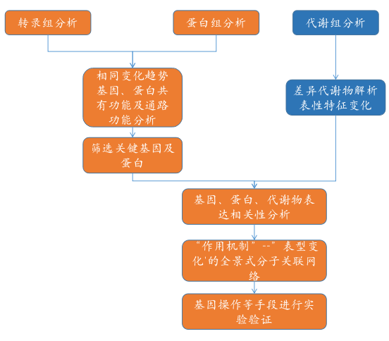 轉(zhuǎn)錄組、蛋白組、代謝組三者的聯(lián)合分析主要是對(duì)來(lái)源于相同樣本的差異表達(dá)的mRNA、蛋白質(zhì)、代謝物等多個(gè)數(shù)據(jù)集結(jié)合起來(lái)進(jìn)行關(guān)聯(lián)分析,可進(jìn)一步挖掘基因、蛋白、代謝物之間的關(guān)系,以及發(fā)現(xiàn)生物標(biāo)記,解析生物生理活動(dòng)的內(nèi)在機(jī)理。