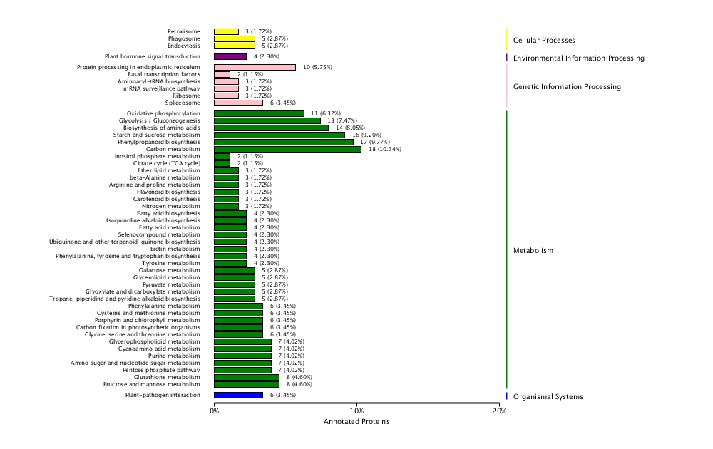針對(duì)轉(zhuǎn)錄水平和蛋白水平關(guān)聯(lián)的蛋白進(jìn)行KEGG功能注釋分析。在生物體內(nèi),不同蛋白相互協(xié)調(diào)行使其生物學(xué)行為,基于Pathway的分析有助于更進(jìn)一步了解其生物學(xué)功能,通過(guò)Pathway分析能確定蛋白質(zhì)參與的主要生化代謝途徑和信號(hào)轉(zhuǎn)導(dǎo)途徑。