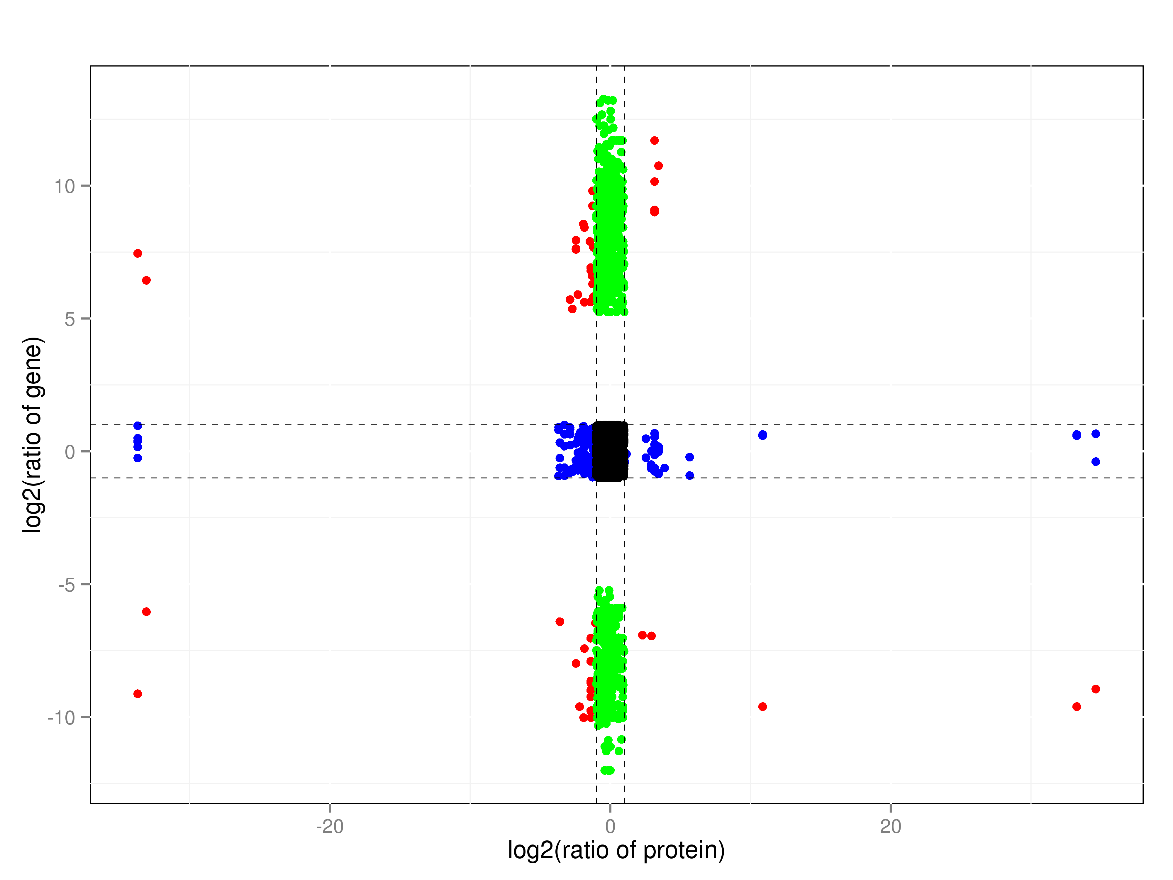 九象限圖是對(duì)數(shù)據(jù)進(jìn)行分類分析的常見方法。一般是利用水平和垂直分割線將圖表區(qū)域分為九個(gè)象限,每個(gè)象限的數(shù)據(jù)表現(xiàn)有所不同,而圖表主要以散點(diǎn)圖為主。對(duì)于每一對(duì)關(guān)聯(lián)的基因和蛋白,以其中蛋白的log2FC作為橫坐標(biāo),基因的log2FC作為縱坐標(biāo),得到所有差異分組的蛋白和轉(zhuǎn)錄組表達(dá)模式九象限圖,進(jìn)一步把基因和蛋白的表達(dá)劃分為更詳細(xì)變化趨勢(shì),有助于篩選符合研究預(yù)期的基因和蛋白集合。