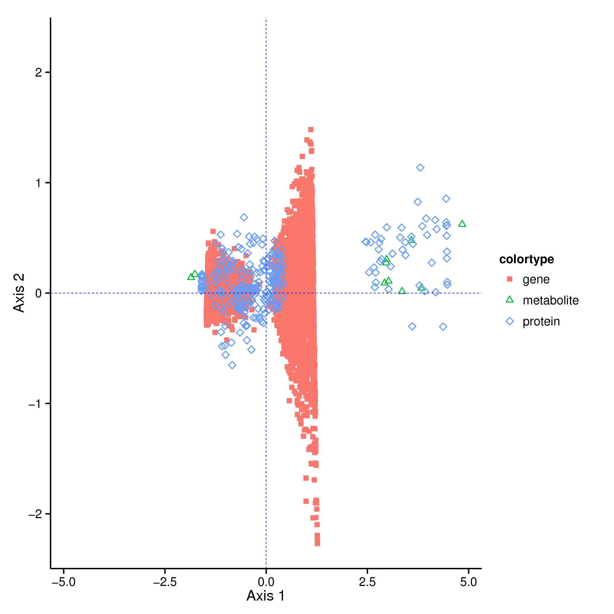 多重協(xié)慣量分析(multiple co-inertia analysis)是一種挖掘多個(gè)數(shù)據(jù)集之間共同關(guān)系的探索性數(shù)據(jù)分析方法,可將多種組學(xué)數(shù)據(jù)投影到相同的維度空間,直觀的展示基因、蛋白、代謝等一種或者多種之間的聯(lián)系,圖中任意2個(gè)數(shù)據(jù)點(diǎn)與原點(diǎn)的連線反映了兩者之間的相關(guān)性,銳角為正相關(guān),鈍角為負(fù)相關(guān),直角則不相關(guān)?;谘芯勘尘翱商崛≈匾奶卣餍畔?。