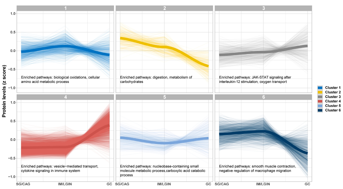 對三個(gè)預(yù)選定的受試者組進(jìn)行了蛋白質(zhì)組學(xué)數(shù)據(jù)的無監(jiān)督聚類分析:即輕度胃病變 (SG/CAG)、晚期胃病變 (IM/LGIN) 和胃癌(GC),揭示了從胃病變到 GC的不同特征。然后沿著胃病變進(jìn)展的級聯(lián)探索了詳細(xì)的蛋白質(zhì)表達(dá)模式,并提取了 6 個(gè)具有相似軌跡的蛋白質(zhì)簇,展示了蛋白質(zhì)組學(xué)譜的從輕度胃病變、晚期胃病變至GC的動態(tài)變化。
