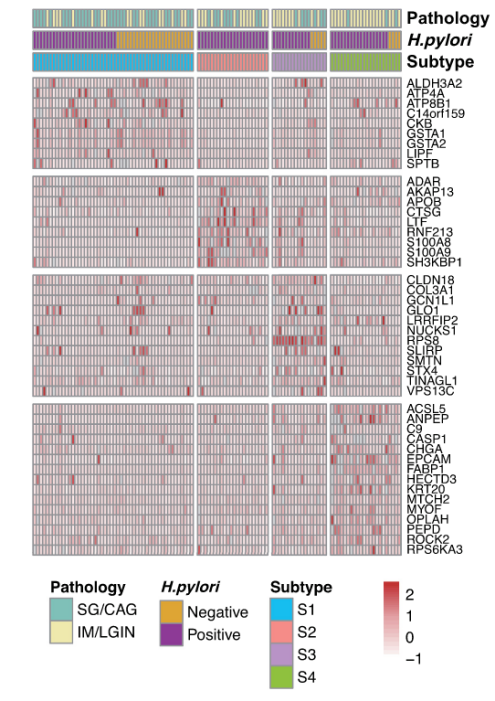 其后文章中討論了超出細(xì)胞形態(tài)水平的胃病變(SG、CAG、IM 或 LGIN)的分子相似性和異質(zhì)性?;谠诔^ 3/4 的胃病變受試者中檢測到的前 100 種變異最大的蛋白質(zhì),通過NMF算法得出胃病變的 4 個(gè)分子亞型(S1-S4)。發(fā)現(xiàn)分子亞型與病理診斷的嚴(yán)重程度之間存在顯著相關(guān)性,亞型 S1 代表蛋白質(zhì)組學(xué)定義的輕度胃病變,S4 代表最嚴(yán)重的胃病變。