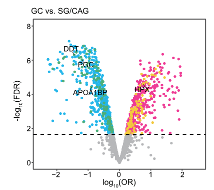 文章研究了關(guān)鍵的單個(gè)蛋白質(zhì),以尋找有關(guān)潛在方便生物標(biāo)志物的線索。1201個(gè)蛋白質(zhì)在發(fā)現(xiàn)階段與侵襲性GC風(fēng)險(xiǎn)顯著相關(guān)(FDR-q<0.05,邏輯回歸分析),并集中驗(yàn)證了217個(gè)早期GC風(fēng)險(xiǎn),包括104個(gè)正相關(guān)蛋白和113個(gè)負(fù)相關(guān)蛋白。