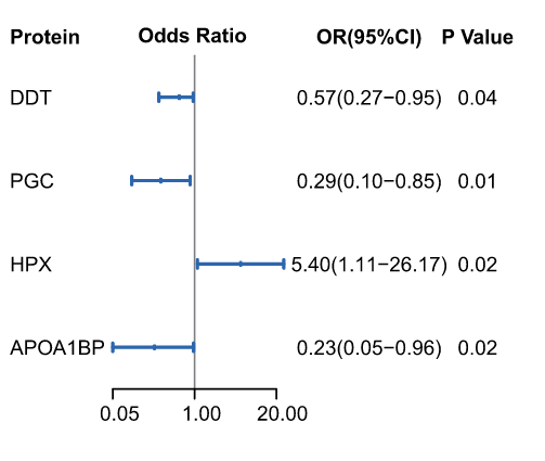 通過對驗(yàn)證集中受試者的前瞻性隨訪,考查了上文詳述的217種蛋白質(zhì)與胃病變進(jìn)展風(fēng)險(xiǎn)之間的關(guān)聯(lián)。其中的四種蛋白質(zhì),即 APOA1BP、PGC、HPX 和 DDT,進(jìn)一步與胃病變進(jìn)展風(fēng)險(xiǎn)和隨訪終點(diǎn)發(fā)生IM或更嚴(yán)重胃病變的風(fēng)險(xiǎn)顯示出相關(guān)(P < 0.05,邏輯回歸分析)。HPX與早期GC和胃病變進(jìn)展呈正相關(guān),而 APOA1BP、PGC 和 DDT 呈負(fù)相關(guān)。這四種突出顯示的蛋白質(zhì)分別聚集在蛋白簇-2 (PGC)、-4 (HPX)、-5 (APOA1BP) 和 -6 (DDT) 中。