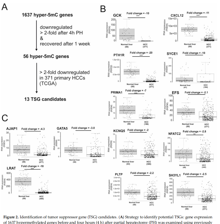 在肝再生過程中,增殖基因被激活,而抗增殖基因被抑制,從而使靜止的肝細(xì)胞重新進(jìn)入細(xì)胞周期。本研究選取小鼠三分之二肝部分切除術(shù) (PH) 之前和之后四小時(shí)檢測(cè)高甲基化基因的表達(dá)水平,挑選標(biāo)準(zhǔn)是與對(duì)照假手術(shù)(SH)相比表達(dá)量下調(diào)超過兩倍的基因,以及這些基因應(yīng)該在部分肝切除術(shù)后一周內(nèi)恢復(fù)表達(dá)量(圖2A)?;谶@些標(biāo)準(zhǔn),選取了56個(gè)基因。之后在TCGA的 371 個(gè)人類原發(fā)性 HCC和50個(gè)正常肝臟的RNA-seq數(shù)據(jù)中比較這些基因的表達(dá),發(fā)現(xiàn)13 個(gè)在 HCC 中下調(diào)超過兩倍(圖2BC),其中有3個(gè)基因已知是腫瘤抑制基因(圖 2C) ,分別是粘附連接相關(guān)蛋白 1 (AJAP1)、GATA 結(jié)合蛋白 5 (GATA5) 和卵磷脂視黃醇?;D(zhuǎn)移酶 (LRAT) 。此外,其余10個(gè)潛在的抑癌基因具有不同的功能,包括轉(zhuǎn)錄調(diào)控 (NFATC2)、細(xì)胞遷移 (EFS和CXCL12)、葡萄糖代謝 (GCK) 和細(xì)胞生長(zhǎng) (PTH1R 和 SH3YL1)。