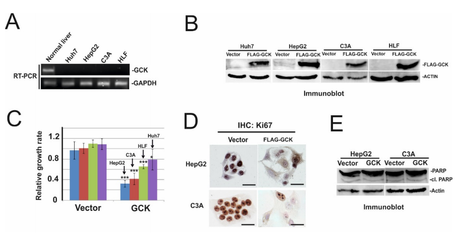 由于葡萄糖代謝的重編程是 HCC 的標(biāo)志之一,進(jìn)一步關(guān)注表征一種TSG 候選物 – 葡萄糖激酶 (GCK) 的抗增殖作用。為了檢驗(yàn)GCK是否可能在HCC 細(xì)胞中發(fā)揮抑癌基因的作用,首先分析了GCK在正常人肝臟和四種HCC細(xì)胞系中的表達(dá),即Huh7、HepG2、C3A 細(xì)胞和 HLF 細(xì)胞(圖3A)。發(fā)現(xiàn)GCK在正常肝臟中高表達(dá),在Huh7、HepG2、C3A細(xì)胞和HLF細(xì)胞中未檢測(cè)到有表達(dá)。然后在這些細(xì)胞系中過表達(dá)帶有FLAG 標(biāo)記的GCK(圖3B) ,并使用結(jié)晶紫實(shí)驗(yàn)檢查細(xì)胞生長(zhǎng)。GCK 的過表達(dá)強(qiáng)烈抑制 HepG2 和 C3A 細(xì)胞的生長(zhǎng),而在 HLF 和 Huh7 細(xì)胞中生長(zhǎng)抑制的效果不太明顯,但仍很顯著(圖3C)。利用增殖標(biāo)記物Ki67進(jìn)行的免疫組化染色證實(shí)了過表達(dá)GCK的HepG2和C3A細(xì)胞生長(zhǎng)受到抑制(圖3D)。為了檢查GCK過表達(dá)后HepG2和C3A細(xì)胞的減少,是否是因?yàn)樵鲋呈艿揭种坪褪艿降蛲稣T導(dǎo),對(duì)凋亡標(biāo)記物PARP進(jìn)行了免疫印跡雜交實(shí)驗(yàn)。如圖3E所示,在GCK過表達(dá)的細(xì)胞中PARP沒有增加。這些數(shù)據(jù)表明GCK的過表達(dá)抑制細(xì)胞增殖但不誘導(dǎo)細(xì)胞凋亡。