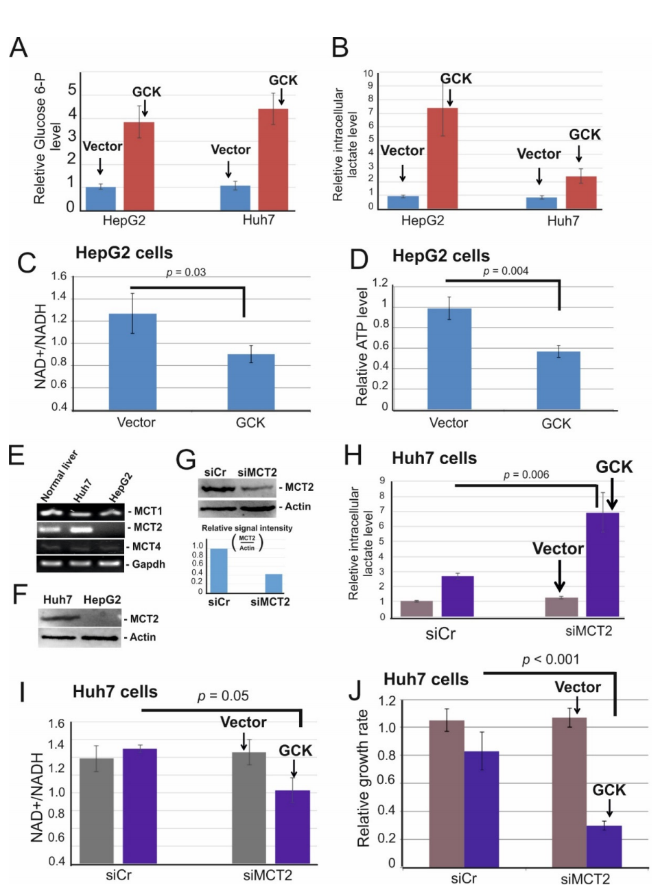 由于GCK過表達(dá)并未強(qiáng)烈誘導(dǎo)Huh7細(xì)胞中的乳酸積累,這就提出了乳酸是如何在這些細(xì)胞中外排的問題。乳酸外排由雙向單羧酸轉(zhuǎn)運(yùn)體(MCTs)介導(dǎo),已知有四種MCT可轉(zhuǎn)運(yùn)乳酸,因此檢測(cè)了在 Huh7 和 HepG2 細(xì)胞中MCT變異體的表達(dá)。有趣的是,HepG2細(xì)胞僅表達(dá)MCT1和MCT4,而Huh7 細(xì)胞表達(dá)了三種變異體(圖4E)。還通過免疫印跡雜交實(shí)驗(yàn)證實(shí)了HepG2 細(xì)胞中缺乏 MCT2的表達(dá)(圖4F)。這些數(shù)據(jù)提出了隨后的問題,即細(xì)胞內(nèi)乳酸積累是否由于HepG2細(xì)胞中缺乏MCT2所致。為了檢驗(yàn)這種可能性,耗盡了GCK過表達(dá)的Huh7細(xì)胞中的MCT2(圖4G) 并檢測(cè)了細(xì)胞內(nèi)乳酸的濃度。事實(shí)上,MCT2 的消耗顯著誘導(dǎo)了乳酸的積累(圖4H)。因此,在MCT2耗盡的細(xì)胞中,NAD+/NADH 比率顯著下降(圖4I) 并伴隨細(xì)胞增殖的減少(圖4J)??傊?,這些數(shù)據(jù)表明MCT2的缺乏在GCK過表達(dá)的細(xì)胞中顯著積累了乳酸。