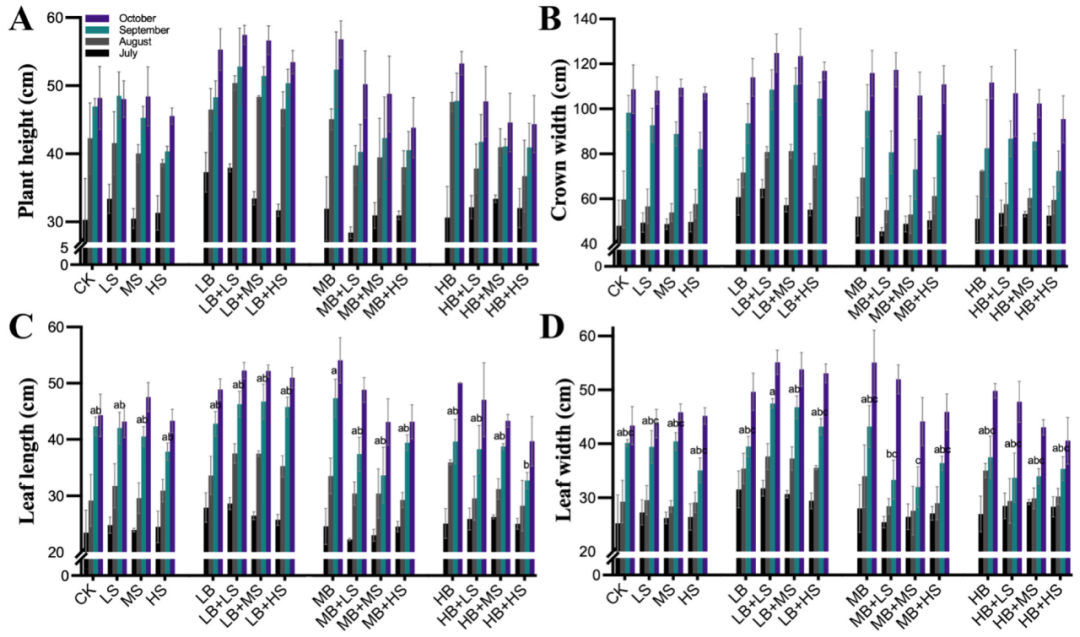 R. palmatum?L.在不同生長時期(7、8、9、10月)的生長參數(shù)如圖1所示。與對照組(CK)相比,任意三種濃度的細(xì)菌接種劑(LB、MB和HB)處理后的株高、冠寬、葉長和葉寬都有所增加。我們的結(jié)果顯示了兩個明顯的倒V形趨勢,在四種含 LB 的處理(LB、LB + LS、LB + MS和LB + HS)中出現(xiàn)了一個外峰。盡管HB處理增加了R. palmatum?L.的生長,但當(dāng)與蔗糖結(jié)合時,它降低了生長,尤其是在 HB + HS 處理下。這表明用高水平蔗糖(15 g/L)修正的高水平細(xì)菌接種劑(1.0 ×?107CFU/mL)抑制了PGPM的植物促生長功能。