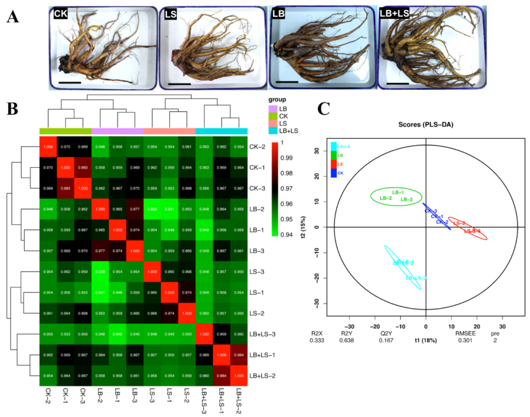 重點放在LB+LS的結(jié)合分組,通過廣靶代謝組學(xué)探索促進植物生長的潛在機制(圖3A)。共對12個新鮮的根樣品進行了表征,鑒定了800種帶注釋的代謝物,主要由38種羧酸及其衍生物、15種有機氧化合物、14種脂肪?;?11種有機氮化合物組成。使用 GC-TOF-MS的全局靶向代謝組分析方法進行相關(guān)偏最小二乘判別分析 (PLS-DA),如圖所示(圖3B),三個生物配對之間的 Spearman相關(guān)系數(shù)均超過0.94,這表現(xiàn)了實驗的高重現(xiàn)性。然后通過PLS-DA評分圖來評估這些植物組織樣品之間的差異(圖3C),結(jié)果顯示出了分組之間的明顯分離。此外,對潛在結(jié)構(gòu)判別分析(OPLS-DA)建模的監(jiān)督正交投影也揭示了這些分組植物組織樣本代謝組比較中的顯著差異。