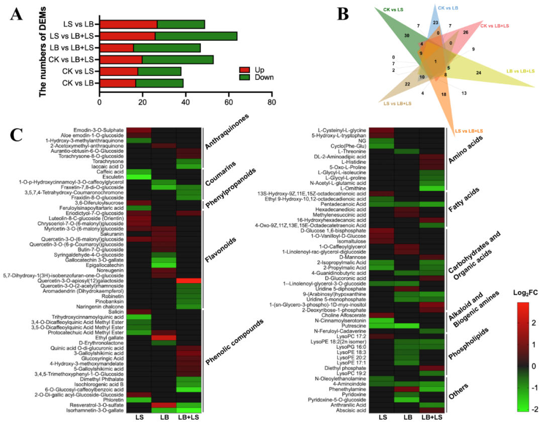 通過VIP(Variable Importance in Projection ) ≥ 1、倍數(shù)變化 ≥ 1.5 和 p 值 ≤ 0.05 的篩選標(biāo)準(zhǔn),顯著鑒定了 38、39、53、47、64 和 49 種差異表達(dá)代謝物 (DEMs,Differentially Expressed Metabolites )分別在 CK vs.LS、CK vs.LB、CK vs.LB + LS、LB vs.LB + LS、LS vs.LB + LS 和LS vs.LB(圖4A)。