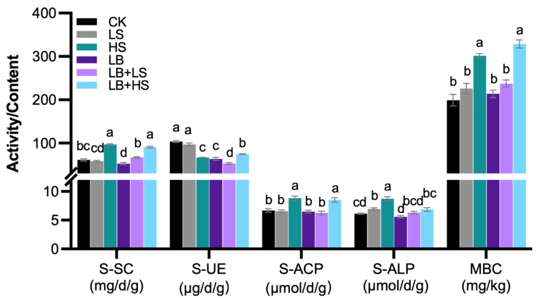 然而,與根際土壤相比,大塊土壤中的硝酸鹽氮(NO3-N)異常高(33.19 ± 2.98 mg/kg),這表明根際微生物對氮的利用率很高。此外,HS根際土壤中有效磷和總磷的量顯著增加,這表明在沒有任何PGPM的情況下添加高蔗糖可能提供了磷轉(zhuǎn)化所需的碳。LB + LS處理顯著增加了總鉀并降低了速效鉀,這表明根際土壤中鉀的利用率有所提高。普遍增加的碳和營養(yǎng)物質(zhì)的可用性也將刺激微生物活動,而酶活性水平的提高證實了這一點(圖5)。