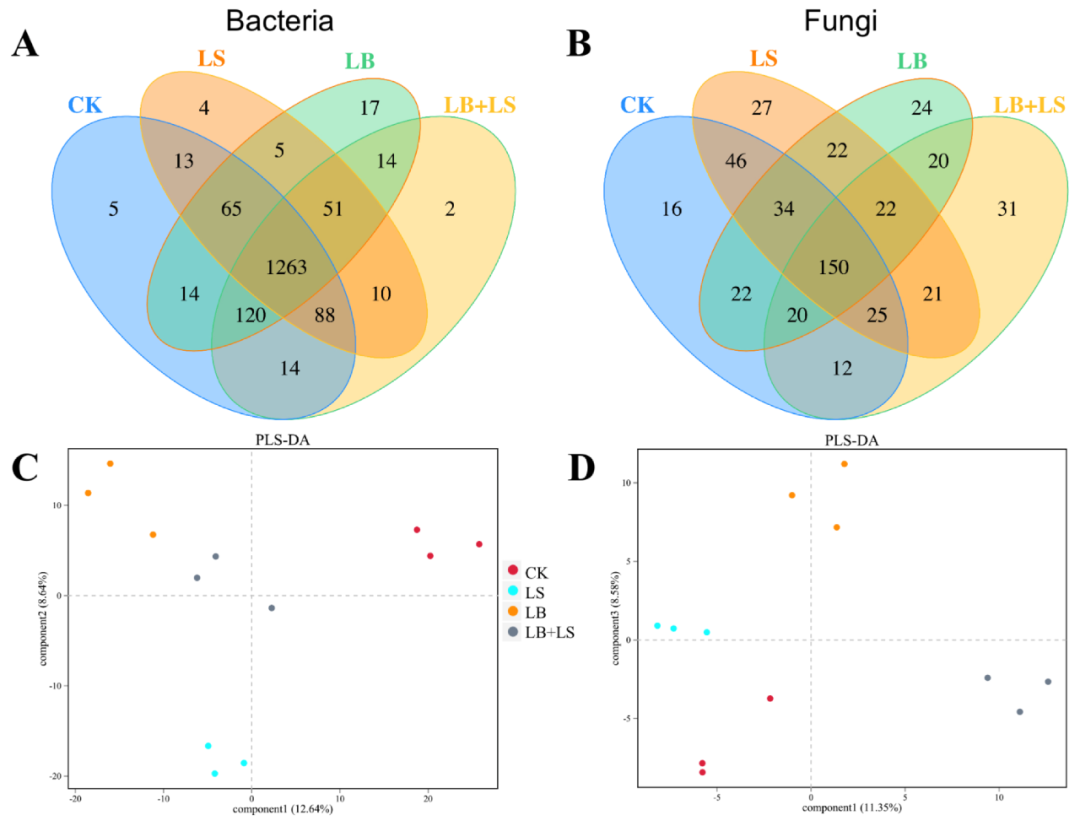 PLS-DA分析顯示,四種處理(CK、LS、LB 和 LB + LS)的樣品在細(xì)菌群落(分別占總變量的 12.64% 和 8.64%)和真菌群落中均分離良好(分別占總變量的 11.35% 和 8.58%)(圖 6C,D)。對于細(xì)菌,處理后的α多樣性雖然與CK相比差異不顯著,但豐富度指數(shù)(Ace和Chao1)和多樣性指數(shù)(Simpson,Shannon,PD Whole Tree除外)在處理中都減少了,特別是在LS土壤中。然而,CK和LB + LS之間的Simpson Index存在顯著差異(p?= 0.0147)。