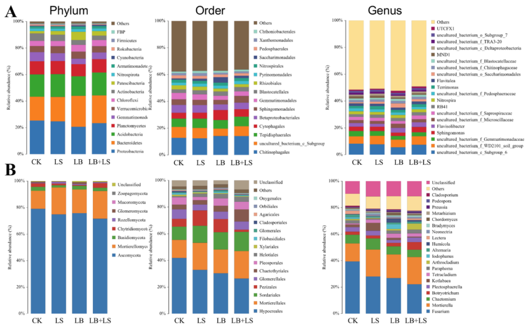 進一步分析微生物群落結(jié)構(gòu)表明,16S rRNA基因序列隸屬于31門257科396屬,而ITS rRNA基因序列隸屬于8門100科170屬。圖7顯示了在群落組成中發(fā)現(xiàn)的15個最豐富的門和目,以及前20個屬。Proteobacteria,Bacteroidetes,Acidobacteria和Planctomycetes是所有樣品中最主要的四種細(xì)菌門(圖7A),占所有分類細(xì)菌序列相對豐度的67.8-71.68%。Proteobacteria是CK、LS和LB +LS 土壤中的主要細(xì)菌門,而Bacteroidetes?(23.4%) 是LB處理土壤中最高的門,其次是Proteobacteria?(20.6%)。這表明PGPM修正后的土壤細(xì)菌群落與蔗糖處理 (LS) 或 CK 后的土壤細(xì)菌群落顯著不同。此外,LB和LB + LS處理的樣品中Cyanobacteria的相對豐度增加,而CK和LS樣品中的Rokubacteria增加。