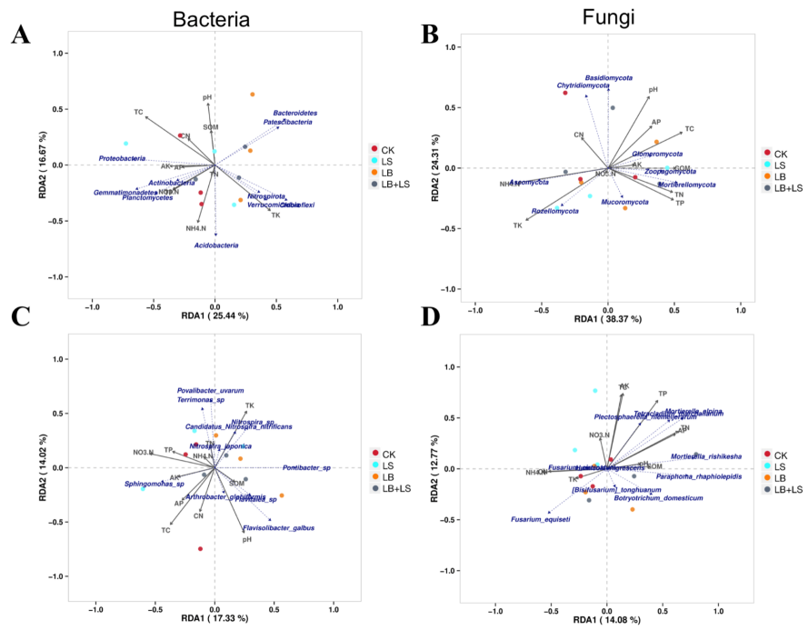 對于門水平的真菌,總?cè)郝浣M成與以下土壤理化性質(zhì)密切相關(guān):TK、NH4-N、TC、pH和TP(圖8B)。LS土壤以Rozellomycota和Mortierellomycota為主,其成員與TK和TP相關(guān)性最高,LB處理的土壤以Mortierellomycota、Zoopagomycota和Mucoromycota為主,與 TP、TN和SOM相關(guān)性最高,以及LB + LS土壤以Basidiomycota和Chytridiomycota為主,它們與土壤pH和C/N有關(guān)。