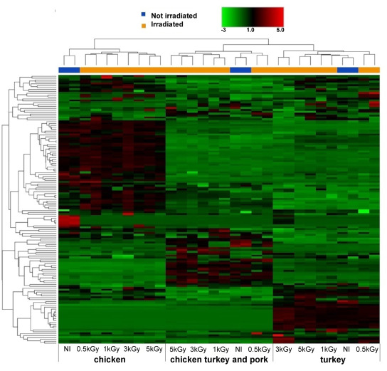 輻照是一種高效滅菌方法,對(duì)肉類保存具有重要作用。本研究基于定性非靶向?HPLC-Orbitrap?代謝組學(xué)方法,旨在估計(jì)輻照雞肉、火雞和混合(雞肉、火雞和豬肉)絞肉的全局代謝組譜變化,以評(píng)估可能存在的食品安全關(guān)于代謝組改變的問題。通過LC-MS共鑒定了?402?種代謝物,并且所有三種基質(zhì)都表現(xiàn)出特定的代謝組譜,該譜組不受應(yīng)用五種不同輻照強(qiáng)度水平的顯著影響。特別是,所有三個(gè)肉類類別都顯示出以下共同特征: