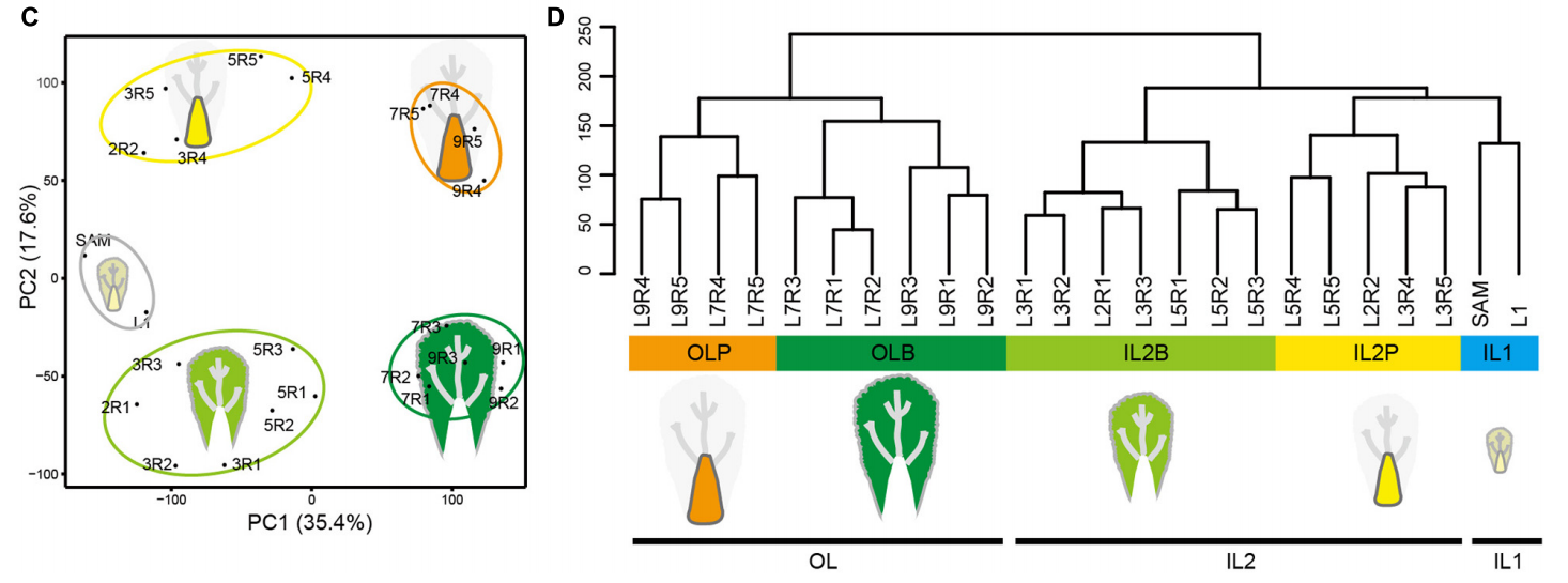 主成分分析(PCA)顯示沿主成分(PC)1和2有明顯的分離。PC1根據(jù)與SAM的距離將葉片樣本分開,而PC2將葉片和葉柄組織分開。層次聚類分析將樣本分為五類,與葉子形態(tài)分化一致。SAM和L1的樣本形成內(nèi)葉1(IL1)最接近莖尖的組織。內(nèi)葉2的葉片(IL2B)和內(nèi)葉2的葉柄(IL2P)代表L2-L5的葉片和葉柄組織,而外葉(OLB)和外葉柄(OLP)代表L2-L5的葉片和葉柄組織外葉(L7和L9),與葉子形態(tài)分化一致。