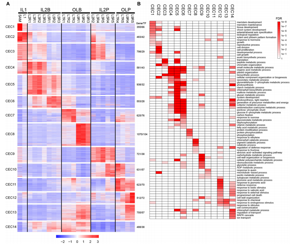 作者在全基因組水平上鑒定了不同葉片中的差異表達基因(DEG),以探索葉片之間的多樣性和潛在功能。通過分析,共發(fā)現(xiàn)9,133DEG,k-means聚類將差異基因分為14個共表達簇(CEC1-CEC14),這些CEC與圖1中的5個聚類簇緊密相關。IL1中DEGs的高表達水平以CEC1和2為代表。CEC1在SAM中高度表達,并以與分生組織發(fā)育、組織發(fā)育和近軸/遠軸極性相關的基因為代表。CEC2在SAM和L1高表達,包含與細胞分裂、細胞增殖、細胞生長和生長素生物合成過程相關的基因。IL2B中DEG的高表達水平以CEC4-6為代表。CEC4、5和6均富集于有機酸代謝過程、淀粉代謝過程、質(zhì)體組織和硫苷代謝、光合光反應等過程。IL2P中DEGs的高表達以CEC9為代表。CEC9富含植物細胞壁相關過程,包括壁組織或生物發(fā)生,以及果膠代謝過程。OLB中DEGs以CEC7和8為代表。CEC7在L7葉片中高表達,并以與蛋白質(zhì)修飾過程、蛋白質(zhì)磷酸化和蛋白質(zhì)絲氨酸/蘇氨酸激酶活性相關的基因為代表。這些結(jié)果反映L7具有明顯的信號轉(zhuǎn)導和基因調(diào)控特征。CEC8在L9葉片中高表達,含有一組與葉綠素分解代謝過程、細胞分解代謝過程、防御反應調(diào)節(jié)、果糖反應和脫落酸激活信號通路相關的基因。OLP中DEG的高表達水平以CEC11和12為代表。CEC11中的基因在L7-L9的葉柄中高度表達,在任何基因本體(GO)術語中均未富集。CEC12中的基因在L9的葉柄中高度表達。這些基因可能主要參與脫落酸激活的信號通路、茉莉酸(JA)代謝過程、JA反應、防御反應、生物刺激反應、水楊酸反應和外部刺激反應。這些結(jié)果表明,L9可能在保護多葉頭部免受外部損害方面發(fā)揮作用。