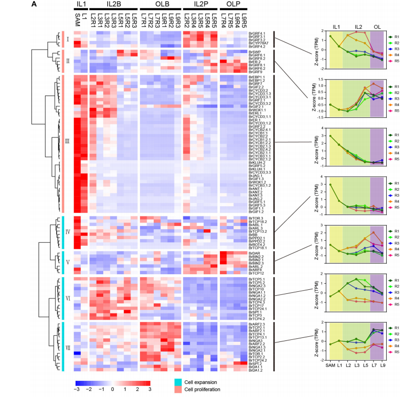 作者鑒定了細胞增殖相關基因和細胞擴張相關基因。結(jié)果表明,大多數(shù)細胞增殖基因在IL1HLs中達到峰值,包括SAM和L1,但在IL2HLs和外HLs中迅速下調(diào)(圖3A),表明細胞增殖基因在不斷生長的內(nèi)葉的起始過程中發(fā)揮重要作用。與細胞增殖基因不同,大部分細胞擴張基因在IL2HLs和外HLs的葉片區(qū)域高表達,且表達模式更為多樣,分為4個簇(圖3A)。此外,大部分細胞擴張基因在IL2HLs和外層HLs之間表現(xiàn)出不同的表達模式,導致L7細胞分裂和細胞擴張調(diào)控的變化明顯高于IL2HLs和外層葉(圖3B)。