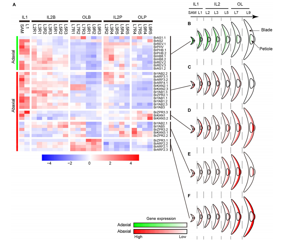 大白菜HLs的彎曲通常被認為是由葉片正軸和背軸之間的不對稱細胞生長引起的。通過分析ad-ab極性基因的表達模式,以探究ad-ab極性基因在頭葉曲率中的作用。結(jié)果表明,與內(nèi)部HL相比,大多數(shù)ad-ab極性基因在外部HL中顯示出顯著不同的表達模式。
