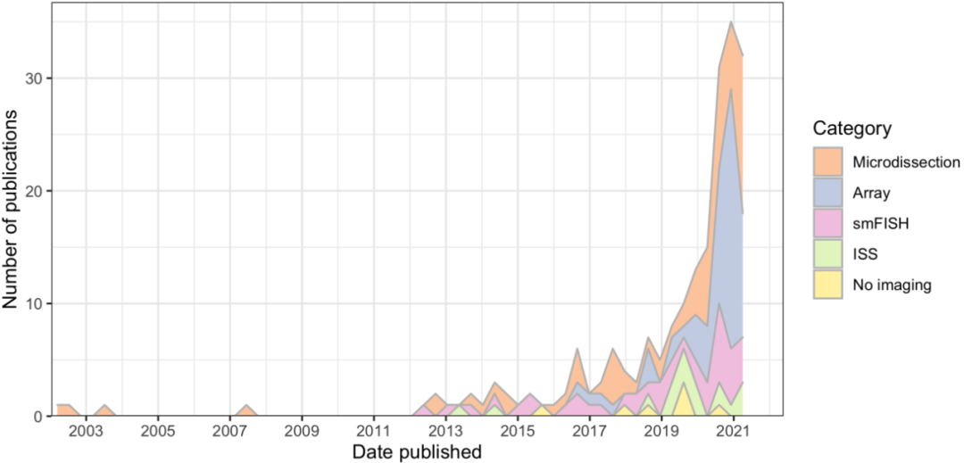 空間組學(xué)相關(guān)論文數(shù)量呈指數(shù)性爆炸增長(zhǎng) Nat Methods. 2022 Mar 10. doi: 10.1038/s41592-022-01409-2.