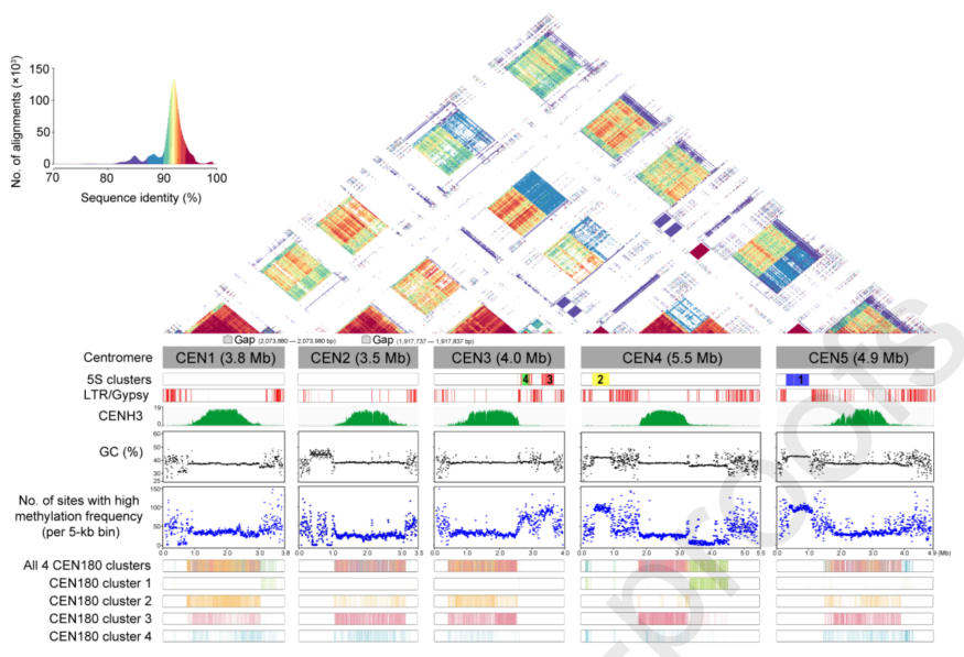 ② ?在雜合度極低的物種中,往往會追求更完美和更準確的組裝,尤其是解析其上高度復(fù)雜的著絲粒位點,植物的著絲粒位于染色體的異染色質(zhì)區(qū)域,該區(qū)域由多種類型的DNA重復(fù)元件組成,主要包括衛(wèi)星DNA序列、單一拷貝DNA、反轉(zhuǎn)錄元件、轉(zhuǎn)座子和端粒類重復(fù)序列等。人類基因組完成圖(Nurk S et al., Science.2022; Altemose N et al., Science.2022; Gershman A et al., Science.2022)、擬南芥T2T基因組(Naish M et al., Science.2021;Wang B et al., GPB.2021)等研究均說明,對著絲粒區(qū)的甲基化等表觀調(diào)控進行解析,具有重要的研究意義。例如,擬南芥T2T基因組研究中,作者發(fā)現(xiàn)著絲粒的DNA甲基化高于著絲粒周圍區(qū)域,但在著絲粒內(nèi)部,CENH3信號富集的CEN180高度串聯(lián)重復(fù)區(qū)域呈現(xiàn)低甲基化狀態(tài)(Wang B et al., GPB.2021)。