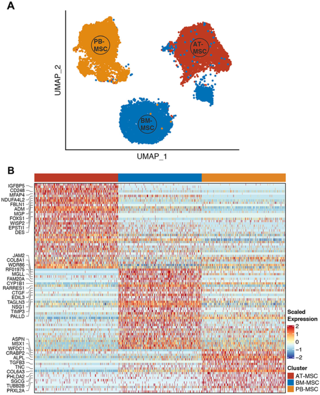 美國(guó)康奈爾大學(xué)獸醫(yī)學(xué)院貝克動(dòng)物健康研究所Van?de?Walle研究團(tuán)隊(duì)于2020年12月4日在Stem?Cell?Research?&?Therapy上發(fā)表了解析MSC異質(zhì)性的研究進(jìn)展。文章利用了scRNA-seq等技術(shù)探索三個(gè)不同組織來(lái)源(AT、BM、PB)的原代馬間充質(zhì)基質(zhì)細(xì)胞的源間和源內(nèi)異質(zhì)性,并確定了檢測(cè)到的轉(zhuǎn)錄差異與細(xì)胞運(yùn)動(dòng)和免疫調(diào)節(jié)功能的表型變異相對(duì)應(yīng),這將提高M(jìn)SC?治療潛力,加速其從實(shí)驗(yàn)室到臨床的過(guò)渡。