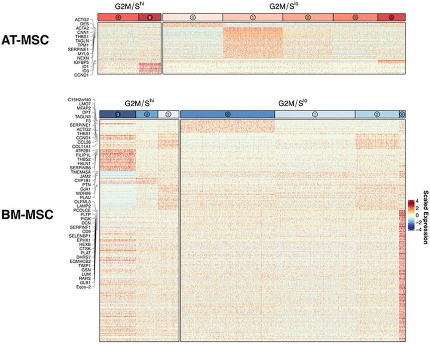 無(wú)監(jiān)督聚類(lèi)分別將AT來(lái)源的MSCs、BM來(lái)源的MSCs和PBM來(lái)源的MSCs聚類(lèi)為7,7,10個(gè)clusters(Fig.?4a)。根據(jù)作者最初的分析中,細(xì)胞周期相關(guān)基因的表達(dá)對(duì)聚類(lèi)有很大的影響(Kowalczyk?et?al.,?2015)。在本研究中作者也觀察到一些明顯由與增殖一致的基因表達(dá)模式定義的簇(Fig.?4b),因此,作者進(jìn)一步分析了G1?clusters和G2M/S?clusters,以確定不同細(xì)胞周期分類(lèi)的簇間差異基因表達(dá)模式。在這種分組策略下,差異基因表達(dá)測(cè)試顯示來(lái)自AT、BM和PB衍生的MSCs中存在明顯的源內(nèi)轉(zhuǎn)錄異質(zhì)性,盡管在AT來(lái)源的MSCs中差異較小,差異表達(dá)基因?(DEGs)?以熱圖的形式進(jìn)行展示?(Fig.?5)。為了檢查檢測(cè)到的clusters的假定生物學(xué)功能,作者對(duì)每個(gè)組織中的每個(gè)cluster進(jìn)行了GO功能富集分析,其中BM來(lái)源的MSCs中排名最靠前的是cluster2的細(xì)胞遷移和cluster3中的慢性炎癥反應(yīng),PB來(lái)源的MSCs中排名靠前的是cluster4的蛋白組折疊和cluster6中的趨化性調(diào)節(jié),AT來(lái)源的MSCs沒(méi)有檢測(cè)到任何顯著富集的GO?terms,表明檢測(cè)到的clusters之間的轉(zhuǎn)錄差異極小。