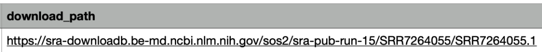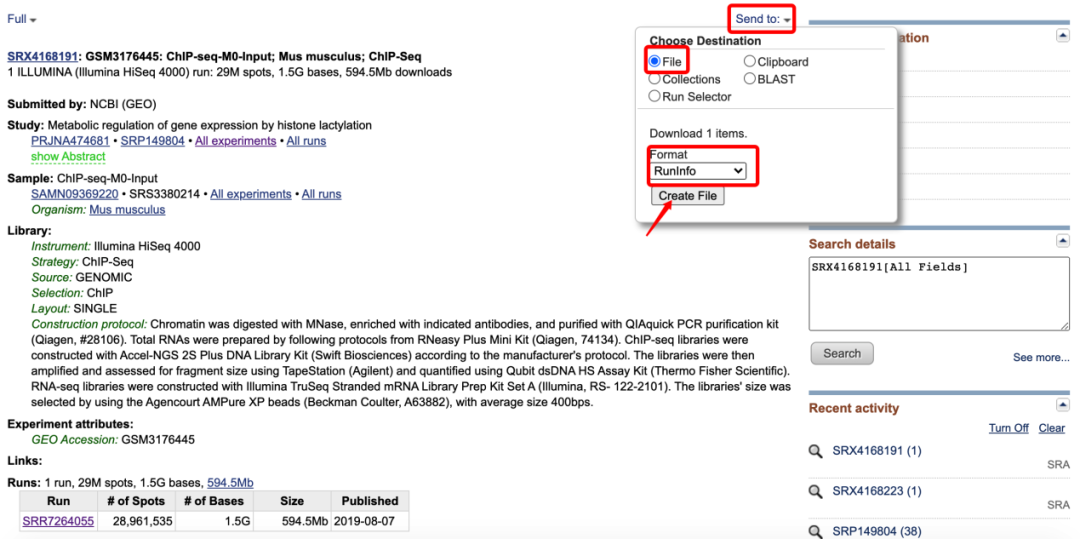 這里面包含了這個樣本的基本信息,包括測序平臺、文庫類型、數(shù)據(jù)量等基本信息,然后點擊頁面右上方的Send to按鈕,選擇File,F(xiàn)ormat選擇RunInfo,然后點擊Creat file下載一個csv文件,打開文件,可以看到一個下載鏈接