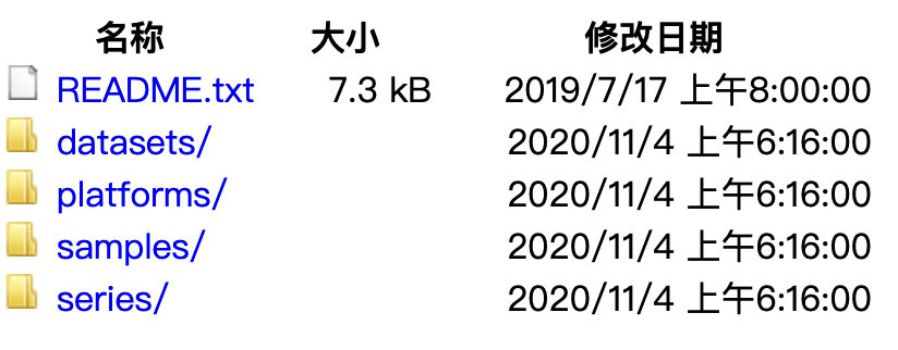 d)?GEO Dataset (GDS) 數(shù)據(jù)集的ID號這些數(shù)據(jù)均可以在ftp(ftp://ftp-trace.ncbi.nih.gov/geo/)進行下載。