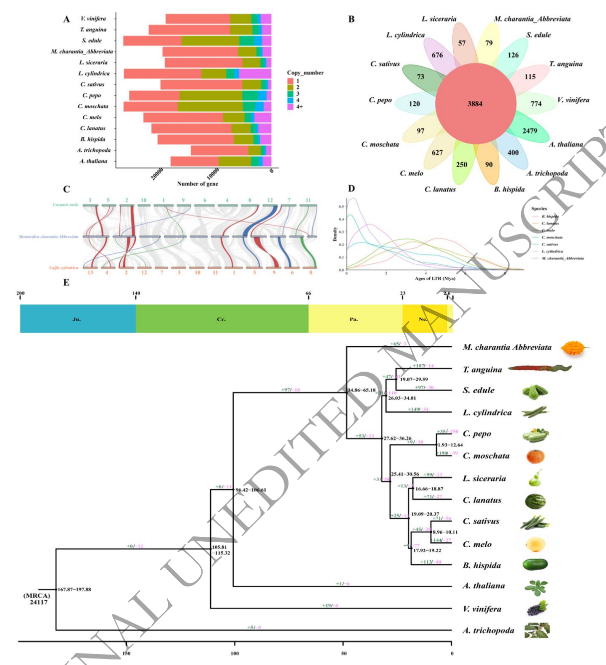 研究顯示,苦瓜在115.08-120.42 Mya時(shí)從其他近緣種中分化出來(lái),0.53-52.49 Mya金鈴子與苦瓜發(fā)生分化。共線性分析顯示,在甜瓜、絲瓜、‘金鈴子’中檢測(cè)到了在馴化過(guò)程中對(duì)果實(shí)成熟和風(fēng)味形成起作用的幾個(gè)共線基因,主要參與植物激素信號(hào)轉(zhuǎn)導(dǎo)、葫蘆素和類胡蘿卜素合成途徑。