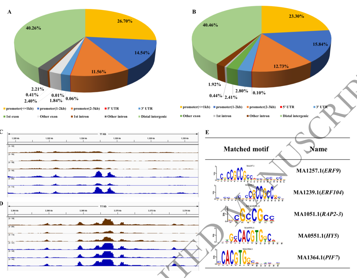 染色質(zhì)的開放區(qū)包含轉(zhuǎn)錄因子結(jié)合位點(diǎn)(TFBS),在轉(zhuǎn)錄因子(TFs)介導(dǎo)的基因表達(dá)調(diào)控中發(fā)揮重要作用。因此,作者通過(guò)對(duì)‘金鈴子’三個(gè)時(shí)期的果實(shí)材料進(jìn)行ATAC-seq分析,以確定在生長(zhǎng)過(guò)程中差異的染色質(zhì)開放區(qū)域。研究發(fā)現(xiàn),未成熟果實(shí)與破色期果實(shí)中,6號(hào)染色體上存在差異染色質(zhì)開放區(qū),主要是與類胡蘿卜素途徑和植物激素信號(hào)傳導(dǎo)相關(guān)的基因;破色期與成熟期果實(shí)相比,3號(hào)染色體上存在差異染色質(zhì)開放區(qū),主要的影響基因有乙烯應(yīng)答轉(zhuǎn)錄因子WRI1、乙烯應(yīng)答轉(zhuǎn)錄轉(zhuǎn)錄因子ERF118和生長(zhǎng)素應(yīng)答因子1(ARF1)等。