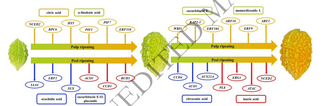?為了更全面地了解‘金鈴子’果實(shí)的發(fā)育成熟過(guò)程,作者對(duì)‘金鈴子’果實(shí)三個(gè)不同生長(zhǎng)發(fā)育期的轉(zhuǎn)錄組和代謝組進(jìn)行了系統(tǒng)分析。在果實(shí)生長(zhǎng)發(fā)育前期,共鑒定出515個(gè)差異基因和216個(gè)差異代謝物,在果實(shí)生長(zhǎng)發(fā)育后期,鑒定出4593個(gè)差異基因和376個(gè)差異代謝物,這些差異基因和差異代謝物參與調(diào)控‘金鈴子’果實(shí)生長(zhǎng)發(fā)育過(guò)程中葫蘆素、皂苷、植物激素、氨基酸、脂類、類胡蘿卜素等的生物合成和代謝過(guò)程。這些差異決定了‘金鈴子’果實(shí)的品質(zhì)、營(yíng)養(yǎng)價(jià)值以及果皮顏色的變化,為苦瓜基因組研究提供了一個(gè)新的遺傳資源。