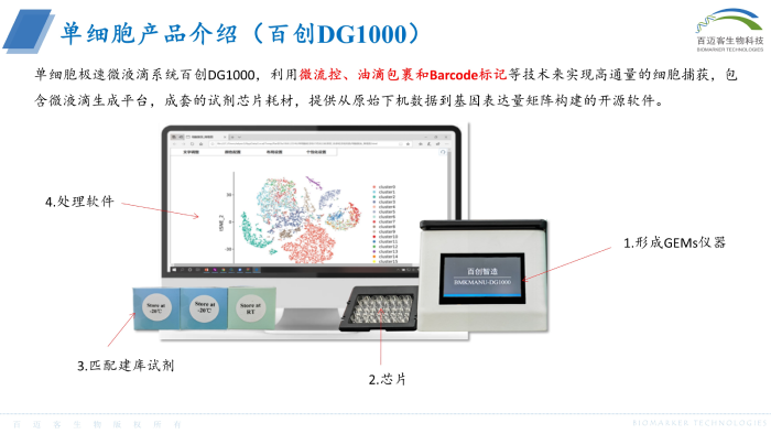 單細(xì)胞極速微液滴系統(tǒng)百創(chuàng)DG1000,利用微流控、油滴包裹和Barcode標(biāo)記等技術(shù)來(lái)實(shí)現(xiàn)高通量的細(xì)胞捕獲,包含微液滴生成平臺(tái),成套的試劑芯片耗材,提供從原始下機(jī)數(shù)據(jù)到基因表達(dá)量矩陣構(gòu)建的開(kāi)源軟件。
