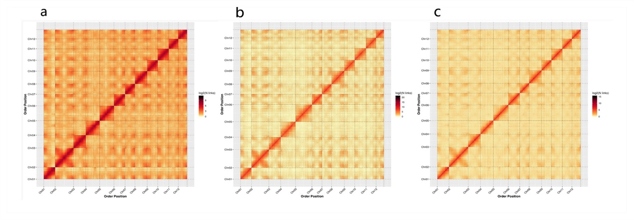 圖1 三個(gè)板栗品種基因組Hi-C熱圖、基因家族聚類及基因PAV信息