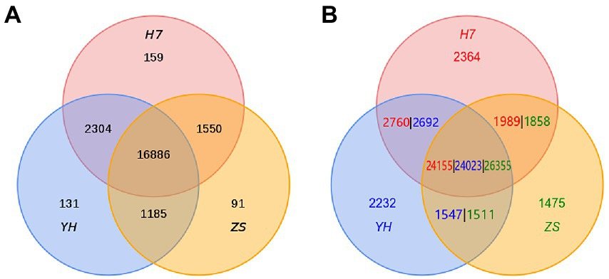 該研究以林果所自主選育的特色板栗良種 ‘燕紅’?(YH,易修剪品種)、‘燕山早生’(ZS,早熟品種) 和‘黑山寨7號(hào)’(H7,耐旱品種)為試驗(yàn)材料,基于納米孔測(cè)序技術(shù)(Nanopore)、Illumina HiSeq X和Hi-C技術(shù),獲得了三個(gè)高質(zhì)量染色體水平的板栗基因組。通過同源基因鑒定和基因家族聚類分析,發(fā)現(xiàn)H7、YH和ZS分別有159、131和91個(gè)特有的基因家族。通過全基因組比對(duì)分析,尋找三個(gè)樣本基因組間的存在/缺失變異(PAV)信息,發(fā)現(xiàn)H7、YH和ZS中分別存在2364、2232和1475個(gè)特有基因(見圖1)。