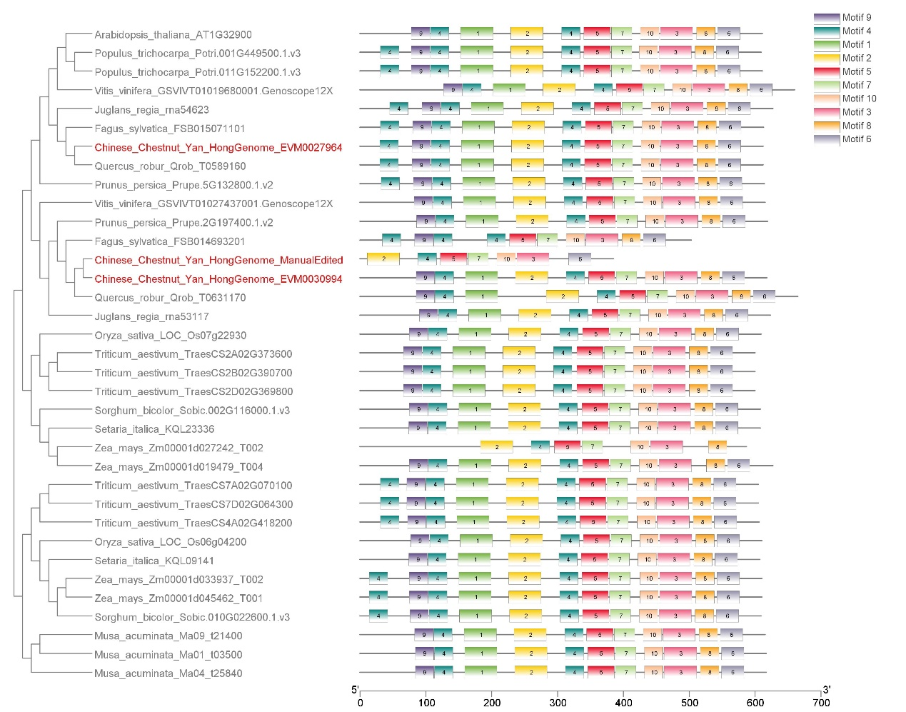 糯性是板栗最重要的食用品質(zhì)之一。然而,關(guān)于板栗中糯性基因報(bào)道卻很少。通過與近緣種比對(duì),發(fā)現(xiàn)板栗中與糯性相關(guān)的基因家族GBSS II存在擴(kuò)張。為了進(jìn)一步探索該家族進(jìn)化趨勢(shì),本研究針對(duì)所有GBSS蛋白和相關(guān)家族成員進(jìn)行了系統(tǒng)的發(fā)育分析。研究表明板栗中的GBSS II-b分支比近源物種多個(gè)成員。